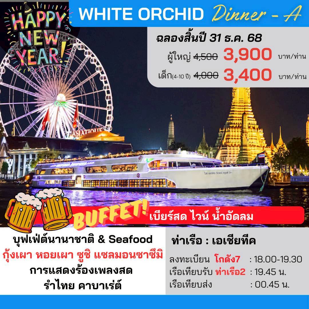 เรือ White Orchid (Dinner-A) ์New Year 2026 ท่าเรือเอเชียทีค (รอบ : 19.45-00.45) เริ่มต้น 3,900.00 บาท