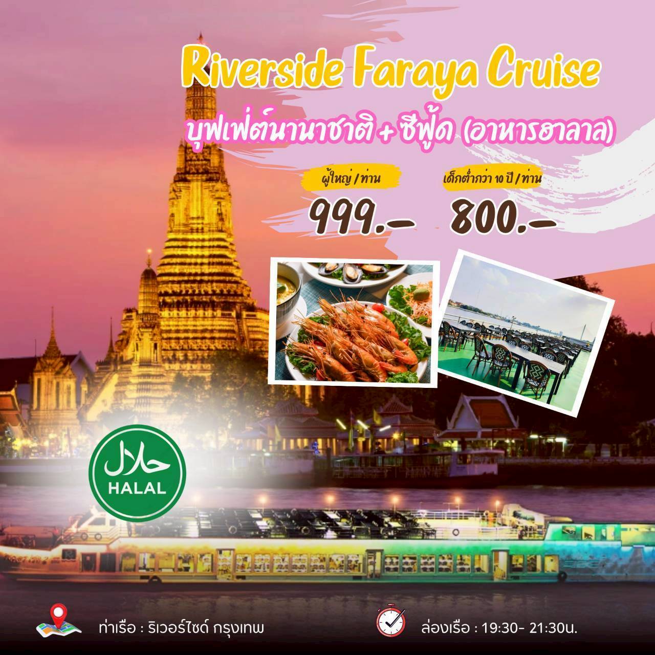 เรือริเวอร์ไซด์ ฟารายา ❤️(ฮาลาล)❤️ 📌 ท่าเรือ : ริเวอร์ไซด์ กรุงเทพ (เวลา : 19:30- 21:30น.) เริ่มต้น 999.00 บาท