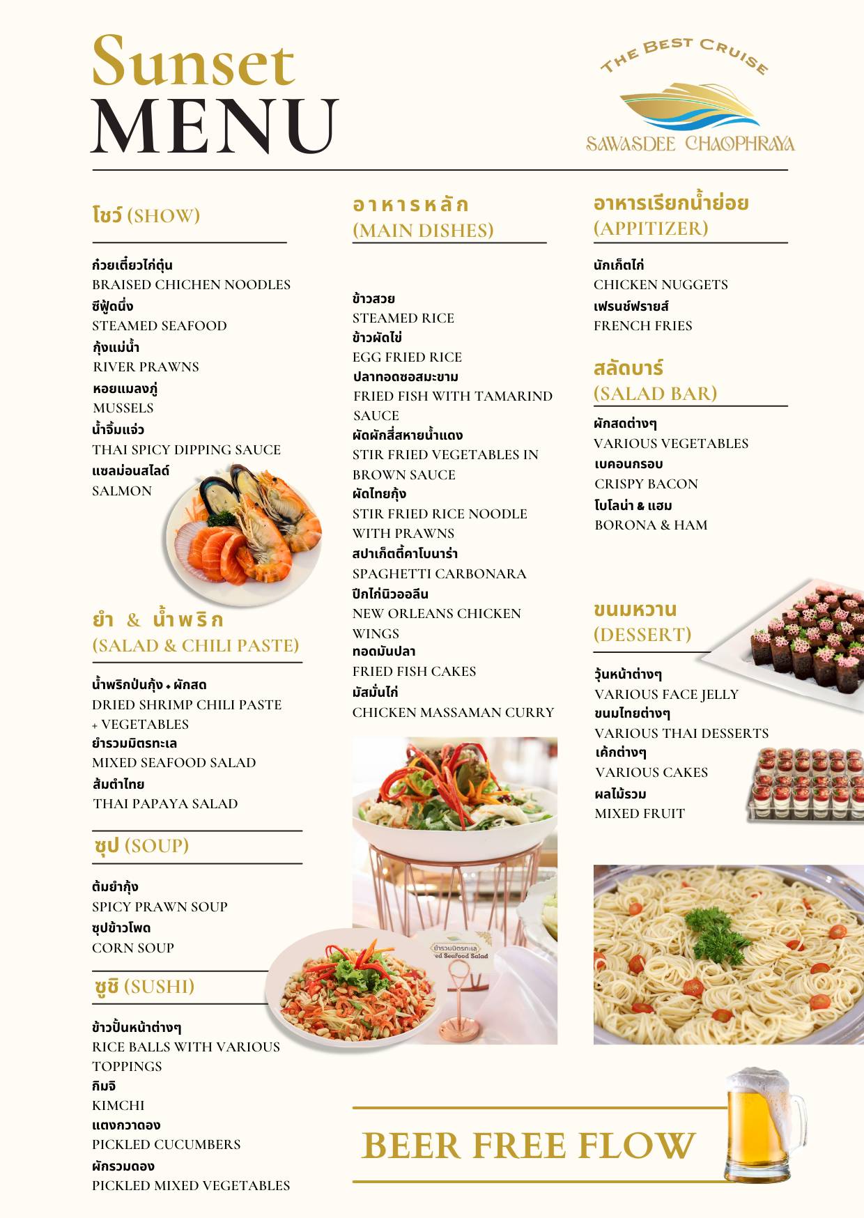 โปรโมชั่นนี้ สามารถใช้จองได้ถึงวันที่ 31 พฤษภาคม 2569ฟรี เค้กวันเกิด สำหรับท่านที่่มีวันเกิดภายในวันล่องเรือ (กรุณาแจ้งล่วงหน้า)เมนูอาหาร