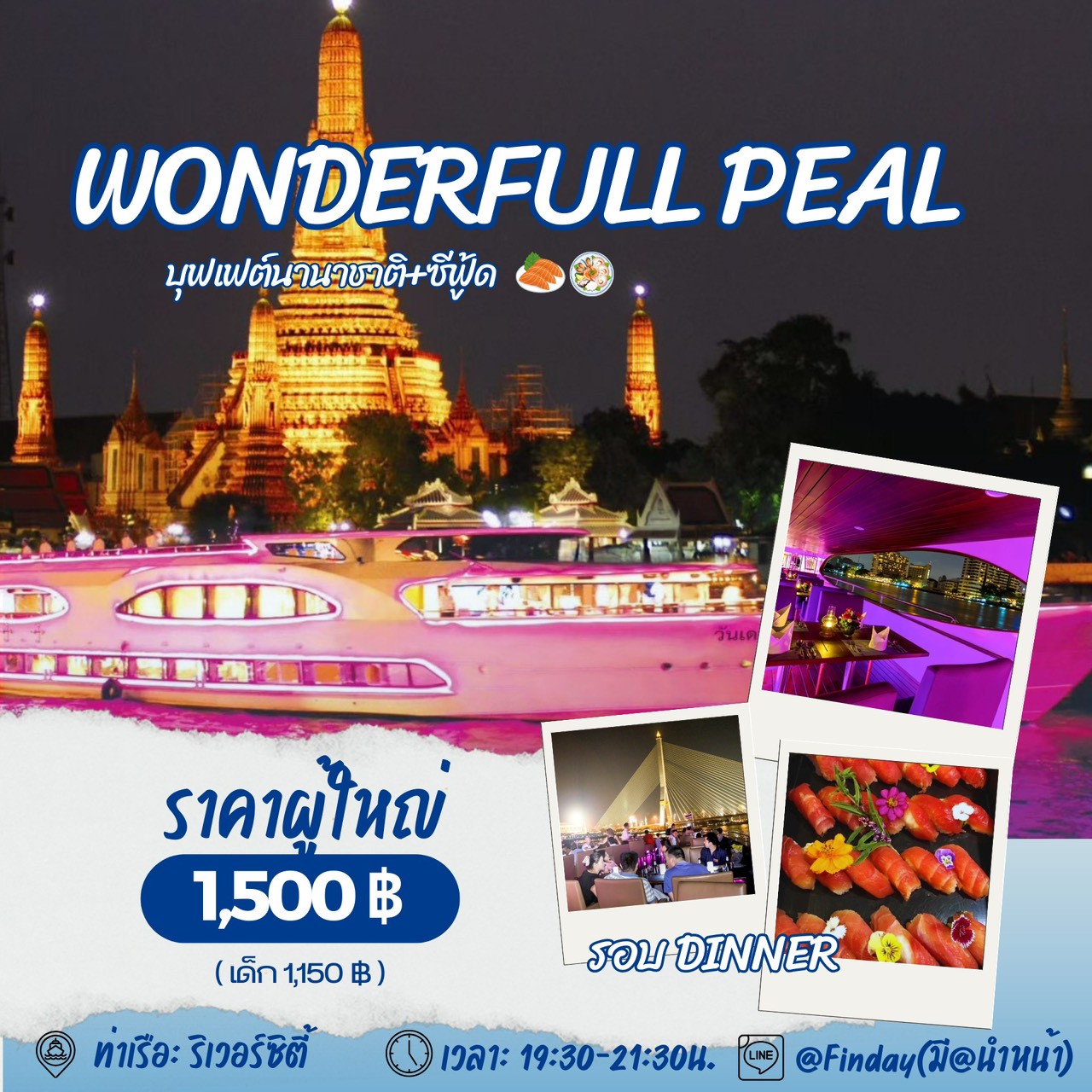 🕔 ล่องเรือ : 19:30-21:30 น.